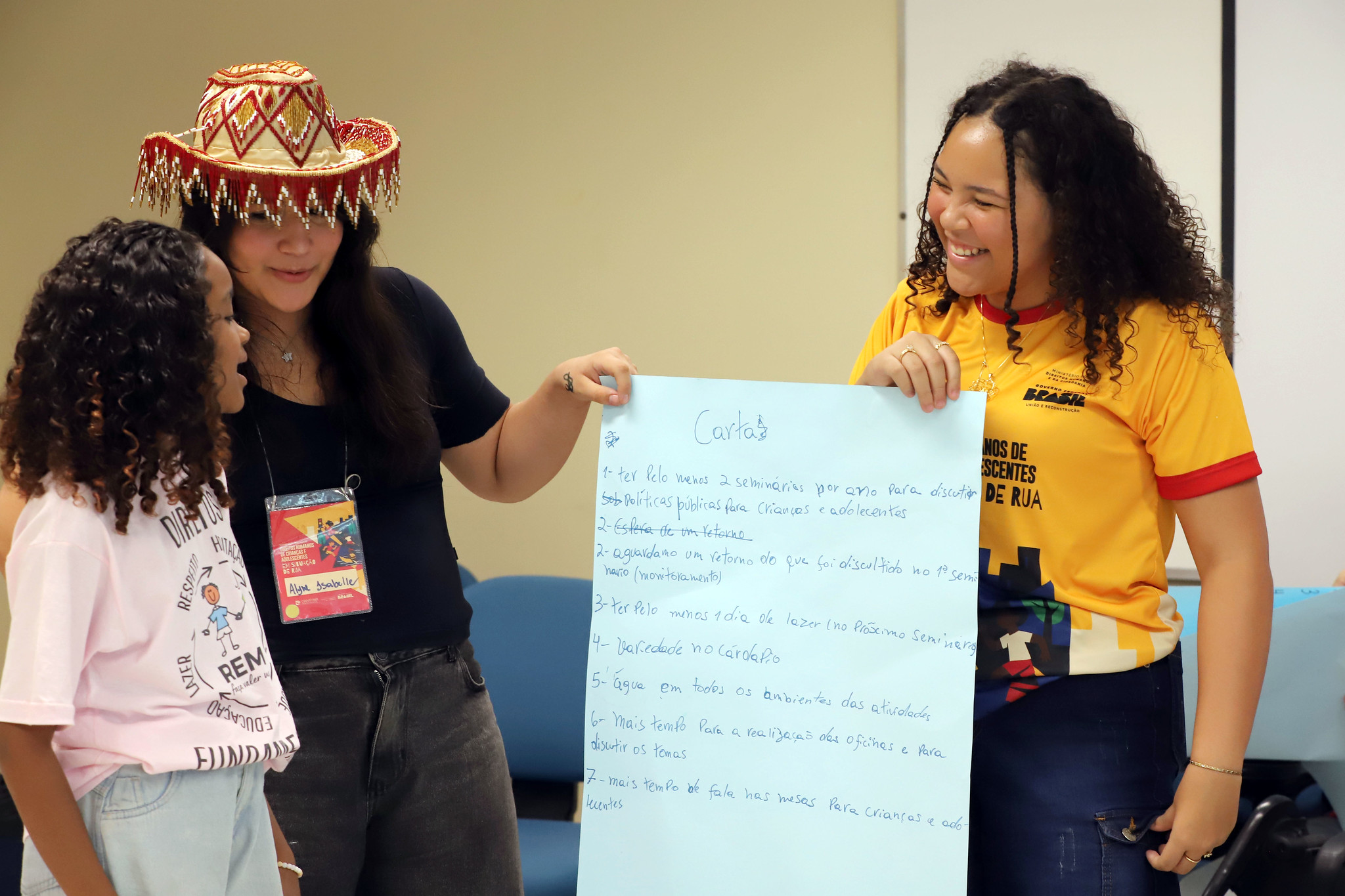 “Viemos lutar pela garantia de direitos de crianças e adolescentes que estão na rua. Que a Carta Compromisso que escrevemos não seja só um papel, mas seja praticada”, enfatizou Keven Gabriel Teles da Costa, 12 anos, de Campina Grande (PB).